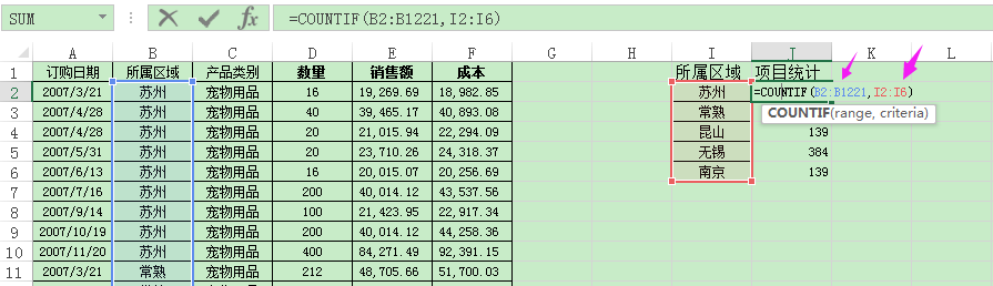 其中,range表示候选区域;criteria表示选择条件,形式可以是数字、表达式或文本,甚至可以使用通配符。