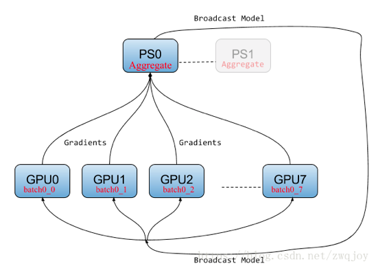 - 各个设备完成一个mini-batch训练之后,不需要等待其它节点,直接去更新模型的参数