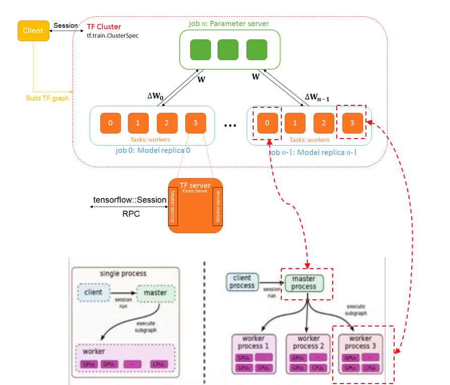 - Worker job 上的Worker Service将负责梯度运算,ps job上的Worker Service将负责参数更新,Master Service将仅有一个会在需要时被用到,负责子图划分与Task派发。