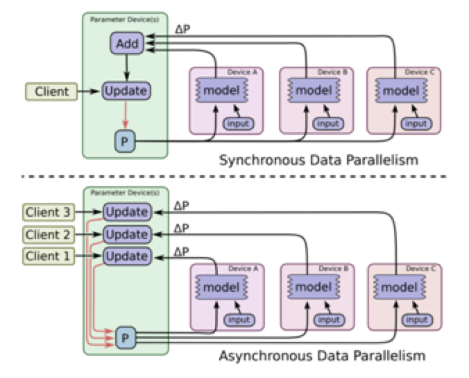 - 模型参数更新:同步(synchronous)和异步(asynchronous)