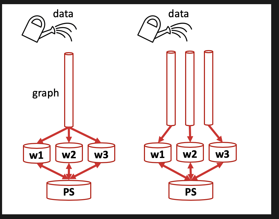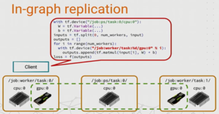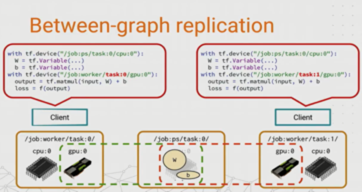 每个worker节点都有各自的client,它们构建相同的计算图,然后把模型参数推送到ps节点上,多个worker共享ps上的参数,只需要更新参数,免除了数据分发环节,在规模较大的情况下,相比 in-graph 提高了训练并行效率和容错性。