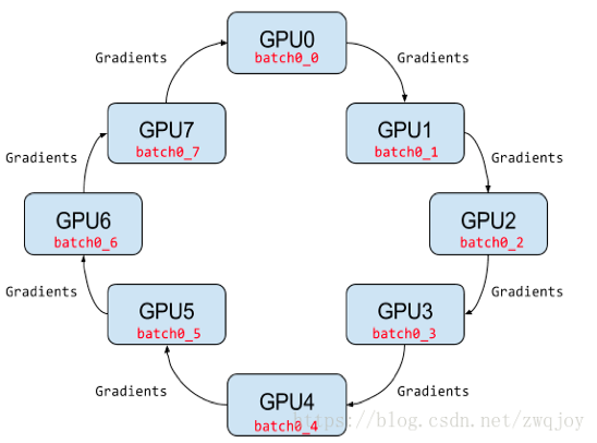 每个 GPU 只从左邻居接受数据、并发送数据给右邻居