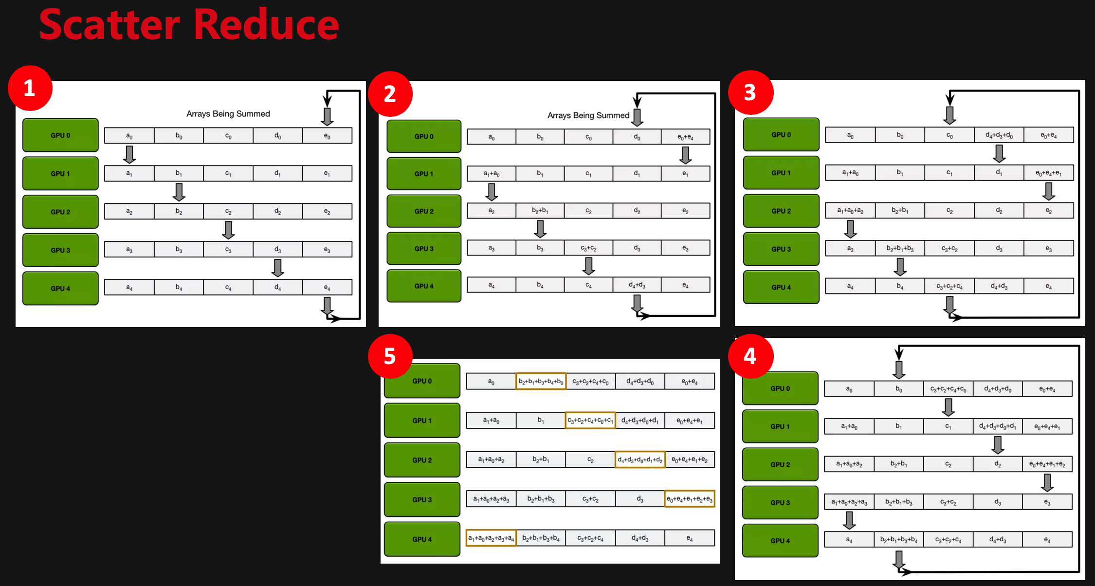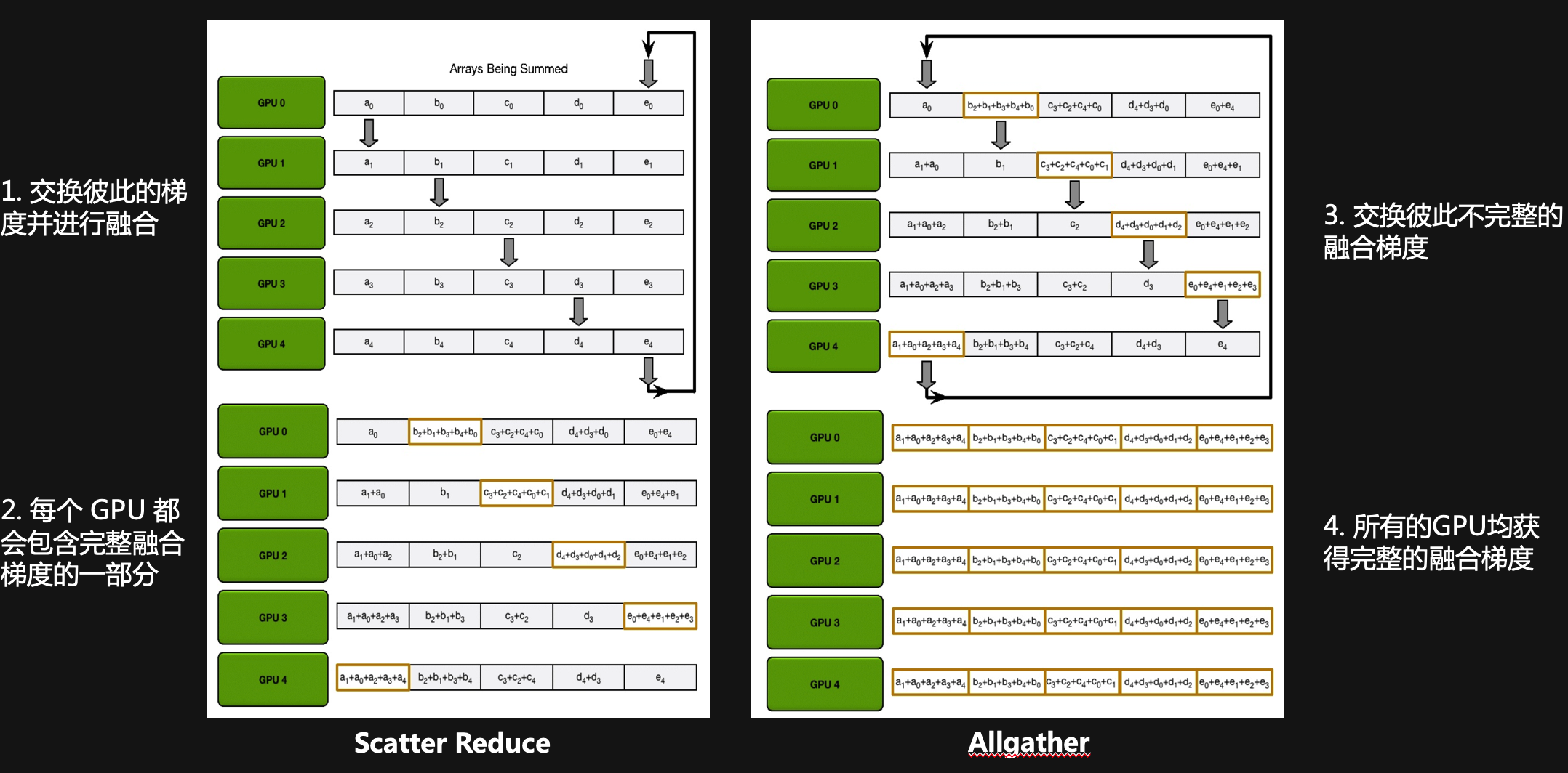 Scatter Reduce:GPU 会逐步交换彼此的梯度并进行融合,最后每个 GPU 都会包含完整融合梯度的一部