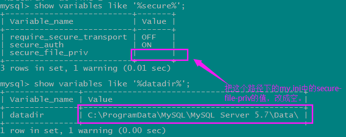 - 修改C:\ProgramData\MySQL\MySQL Server 5.7\Data\my.ini文件中的secure-file-priv=''。