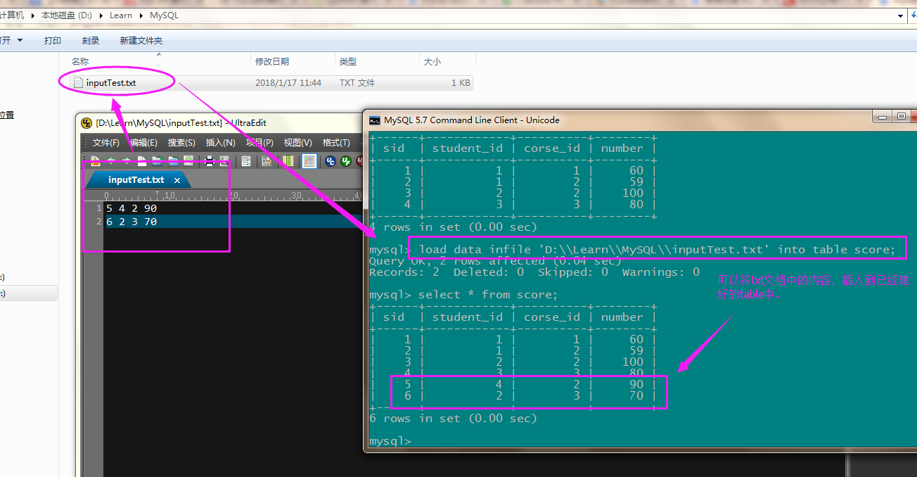 load data infile 'D:\Learn\MySQL\inputTest.txt' into table score;