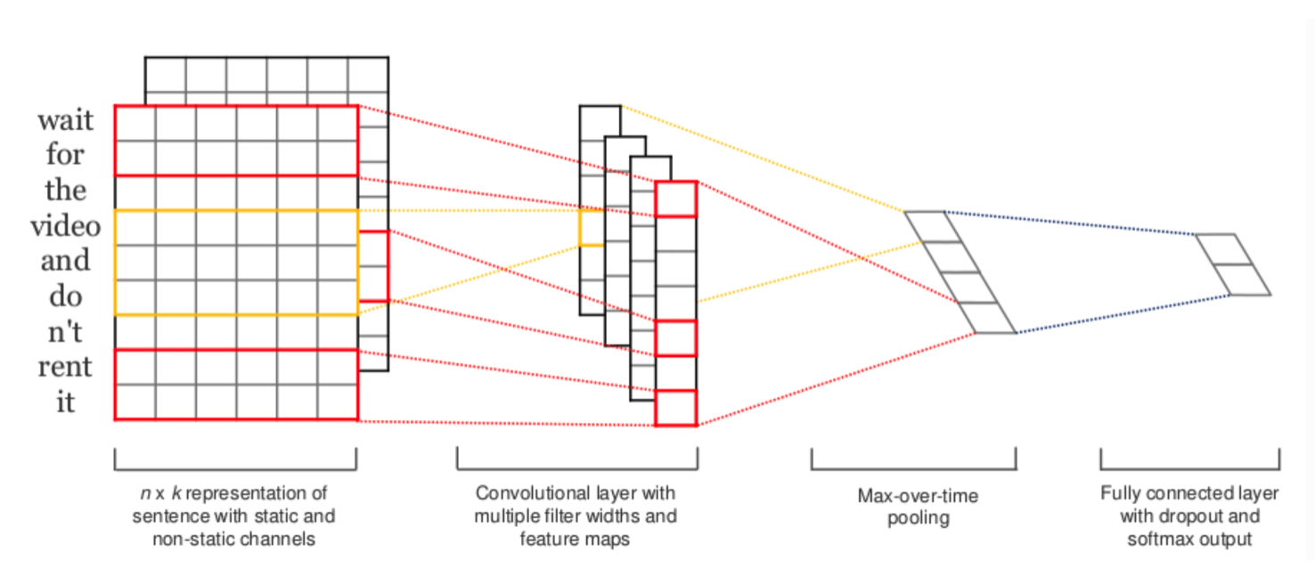 输入:文本向量矩阵(行:每个词、列:每个词的向量表示-word2vec or glove),如果输入有多个channel,则针对每个词使用了多个不同的向量化表示