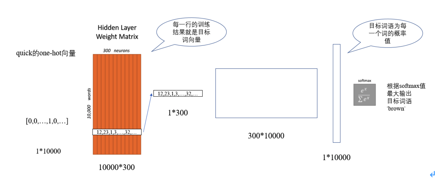 隐藏层矩阵是W’,再使用sW’,获得1V的向量,再经过softmax,即预测词库中所有词的概率,出现最大概率的词,即为当前预测的词