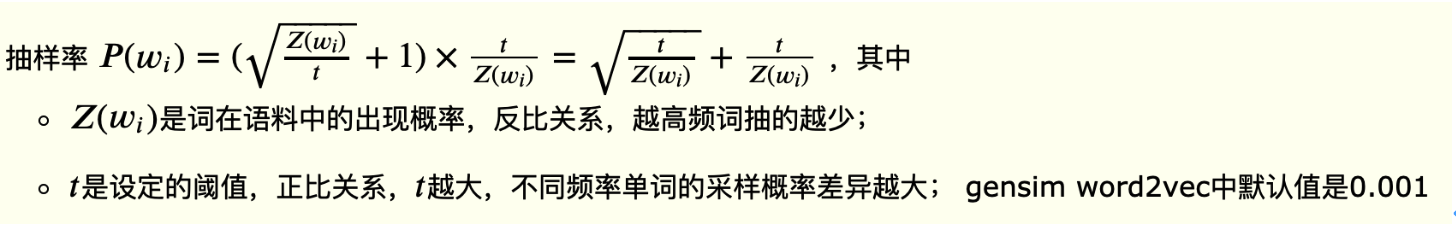 少训练没有区分度的高频词,即基于语料库中的词频,进行抽样,越是高频词,抽样概率越小。计算高频词抽样率P(w)时,有个认为设定的阈值t(即为gensim中的“sample=0.001”),t越大,不同频率词的采样差异越大。