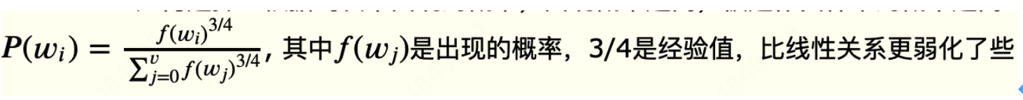 负样本选择:基于词表中出现的概率,出现概率越高,被选作负样本的概率越高(与高频词抽样相反),负样本抽样率P(w)如下: